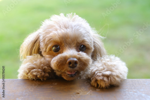 芝生の庭から飼い主を呼ぶトイ・プードル