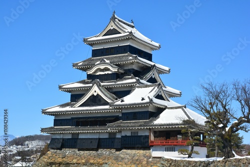 信州 雪の積もった松本城天守 月見櫓・辰巳附櫓