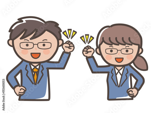 ガッツポーズでやる気満々のメガネ男子とメガネ女子のビジネスマンのイラスト