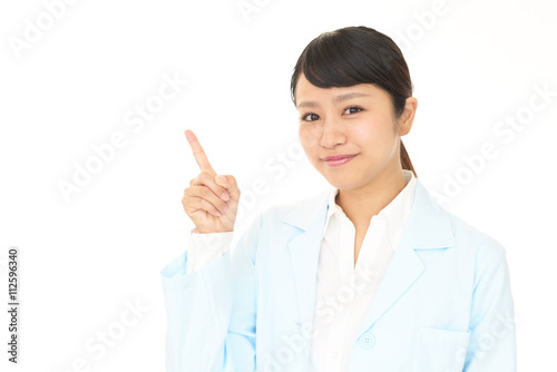 指示する笑顔の薬剤師