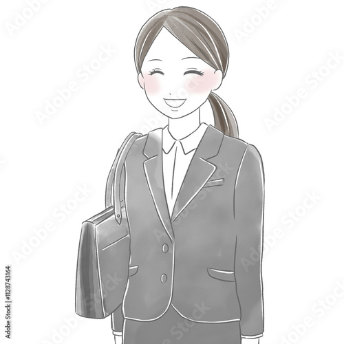 ニッコリと笑顔でバッグを肩に掛けた女性新入社員の水彩風イラスト
