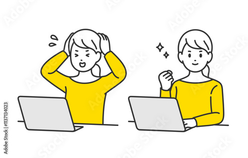 パソコンを見て焦る・ガッツポーズをする若い女性のセット【人物ベクターイラスト素材】