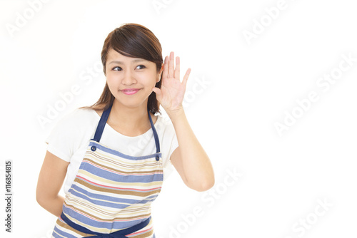 耳に手を当てる主婦