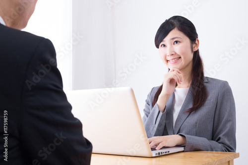 people, woman, woman, girl, japanese, asian, young, 30s, two people, business, ol, suit, employee, corporation, work, work, office, desk, table, table, seated, customer service, interview, consultation, guidance, adviser, planner, counselor, counseling, meeting, trade, version, meeting, speaking, conversation, smile, smile, personal computer, personal computer, notebook