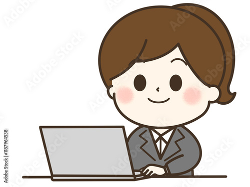 パソコンを使っているスーツを着たポニーテールの女性のイラスト