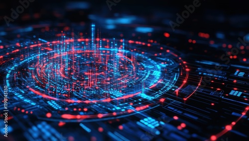 未来的なデジタルデータの視覚化が描かれ、青と赤の光の点が背景で明るく輝く