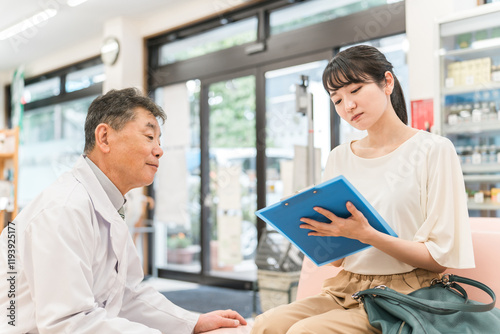 病院・薬局の待合室で問診票を書く女性と相談に乗る薬剤師