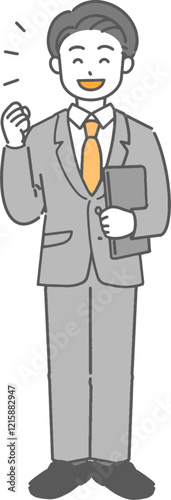 ノートパソコンを持ってガッツポーズをする若いビジネスマン/先生の全身イラスト