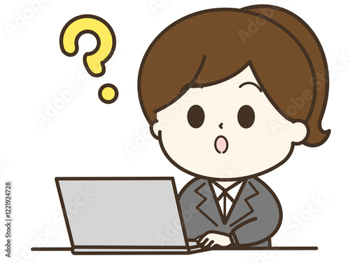 はてなとパソコンを使って疑問を持っているスーツを着た女性のイラスト