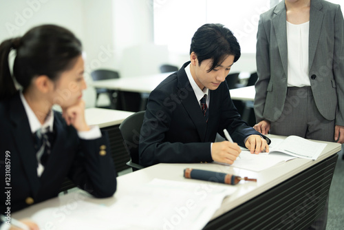 教師と授業で勉強する高校の制服を着たアジアのティーンエイジャー