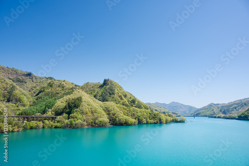 木々の深緑とエメラルドグリーンの水面が美しい八ッ場ダムのあがつま湖