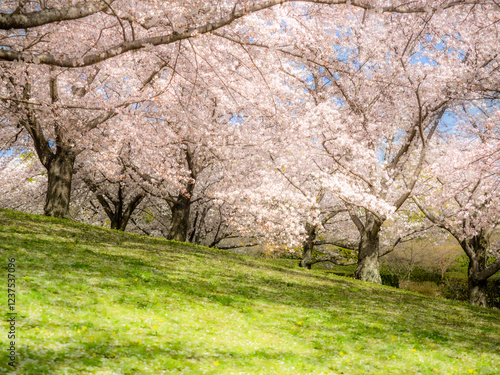 桜の花のある風景。満開の桜並木のある公園。おい花見にちょうどいい木陰の芝生。