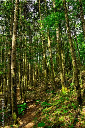 御坂山地の節刀ヶ岳 斜光線射る尾根道の森