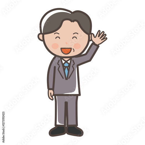 笑顔で手を振る中年の男性ビジネスマンの全身イラスト