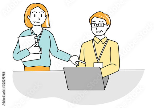 シンプルな線画のオフィスカジュアルで働く中高年の男性と女性のベクターイラストレーション