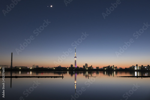 東京都市風景 夕暮れ 黄昏 トワイライト 東京スカイツリーライトアップ 月と金星