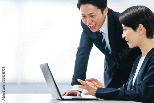 オフィスでノートパソコンを見ながら会話する男女ビジネスパーソンのグループ