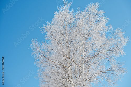 白樺についた霧氷と青空