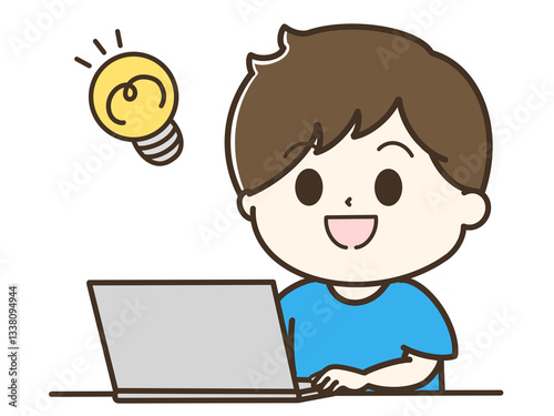 電球とひらめいたパソコンを使う男性の上半身のゆるかわイラスト