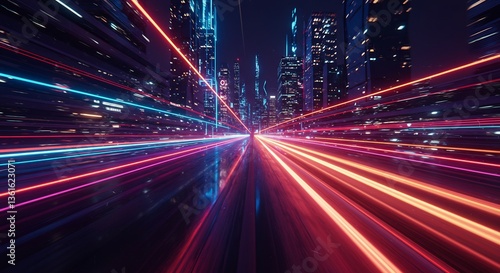 未来都市、鮮やか光跡疾走、ネオン輝く夜景