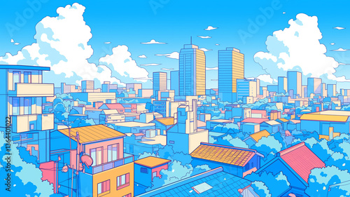 清々しい青空と白く大きな入道雲が印象的な夏の街並み風景・レトロでポップなアニメ調の線画イラスト・緑豊かな都市の暮らしと爽やかな日常を描いた背景素材・青春の情景・癒し系シティライフ