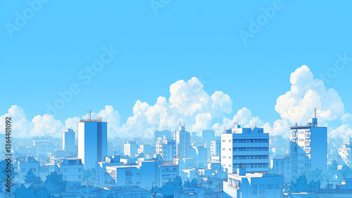レトロポップなアニメ調で描く爽やかな夏の都会風景・青空と巨大な入道雲に包まれた緑豊かな都市街並み・青春と癒しを感じる手描き風イラスト背景素材・ナチュラルで明るい都市ライフのイメージ