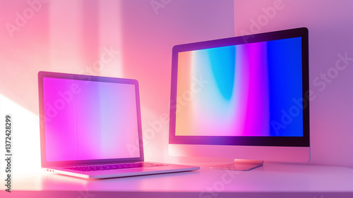 デスクに並んだモニターとノートパソコンのモダンなワークスペース