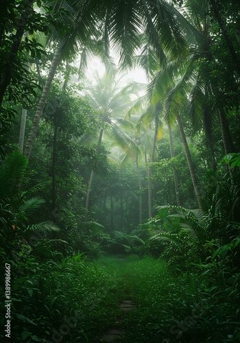 深緑の熱帯雨林、神秘的な光が差し込む道