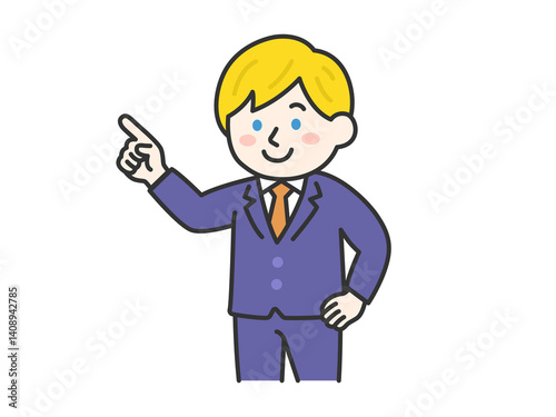 指を指して説明する、スーツ姿の白人男性(線画カラー)のイラスト