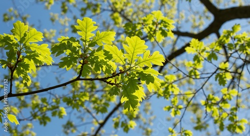 新緑輝く木漏れ日、春の芽吹き鮮やか