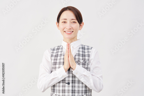 女性 事務員 祈る 合掌 白背景 カメラ目線