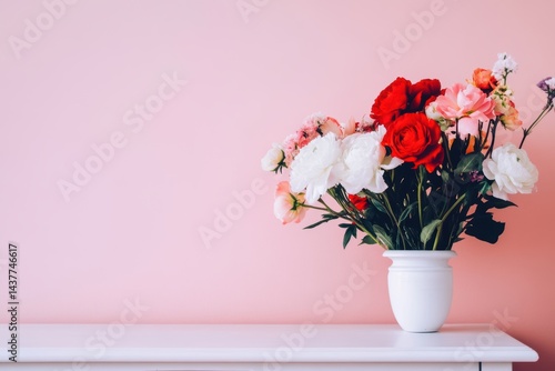 鮮やかな花が白い花瓶に生けられ、柔らかなピンクの壁に映える美しい空間