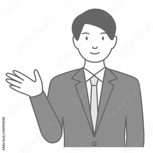 スーツを着た男性が「こちらです」と案内しているイラスト