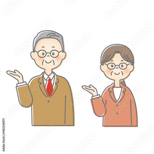 紹介するメガネを掛けたシニアの男女のイラスト 上半身