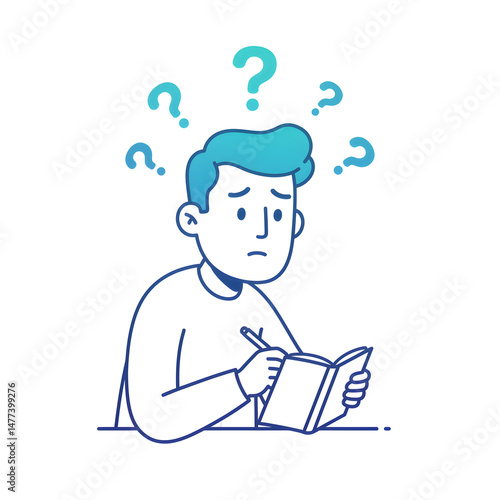 青色の線画、悩み苦しむ青年がノートに書き込む、不安げな表情、疑問符が浮かぶ