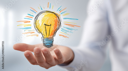 手のひらに浮かぶカラフルな手描き風の電球 ひらめきアイコン(白背景)
