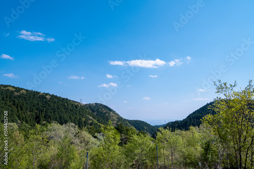 ある晴れた日の山頂からみる新緑と青空