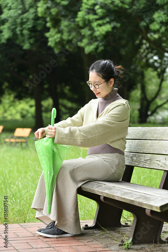 雨傘を持ってベンチに座り微笑む日本人の女性