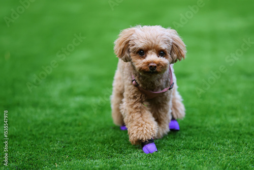 靴を履いてドッグランを走るトイ・プードル