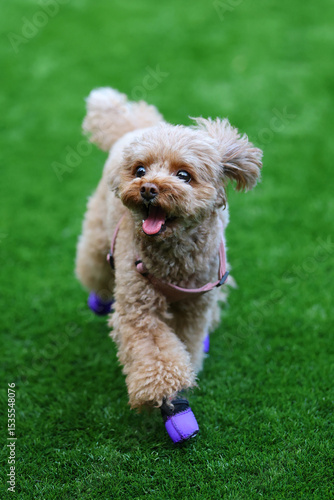 靴を履いて、ドッグランで遊ぶトイ・プードル