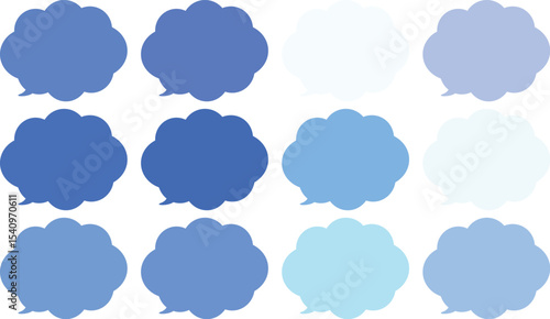 青い雲の形をしたモコモコの吹き出しセット。田12色の青色のふきだし。使いやすいセット。