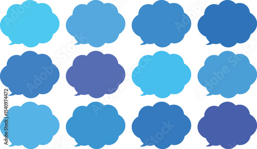 青い雲の形をしたモコモコの吹き出しセット。田12色の青色のふきだし。使いやすいセット。