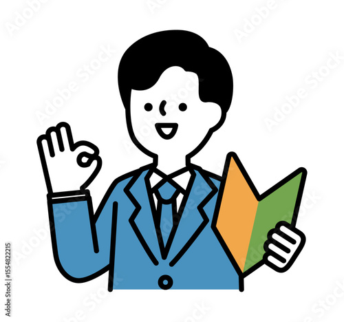 初心者マークを持ってポジティブなポーズをとる笑顔のビジネスパーソンの男性のベクターイラスト