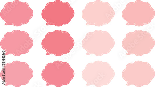 ピンクの暖色系の12色の吹き出しセット。吹き出しの内側に白い破線がある。