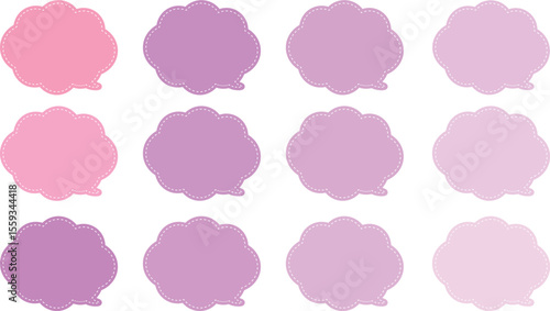 ピンクと紫の暖色系の12色の吹き出しセット。ふきだしの内側には白い破線で囲まれている。