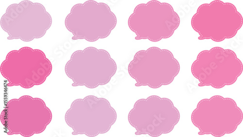 ピンクと紫の暖色系の12色の吹き出しセット。ふきだしの内側には白い破線で囲まれている。