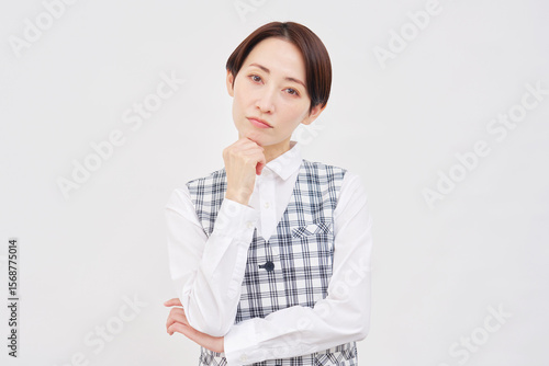女性 事務員 考える 白背景 カメラ目線