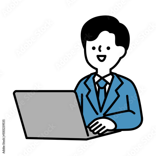 ノートパソコンを操作して仕事をしているスーツのビジネスパーソン男性のイラスト素材