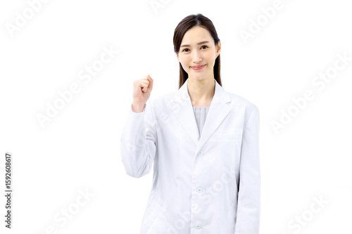 ガッツポーズする白衣の女性 医師