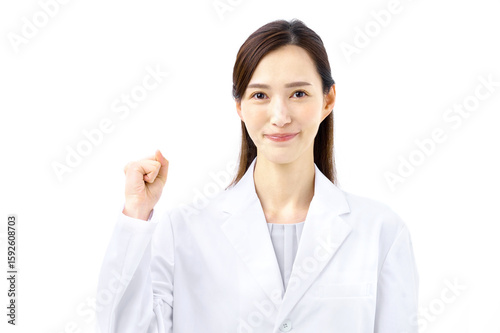 ガッツポーズする白衣の女性 医師